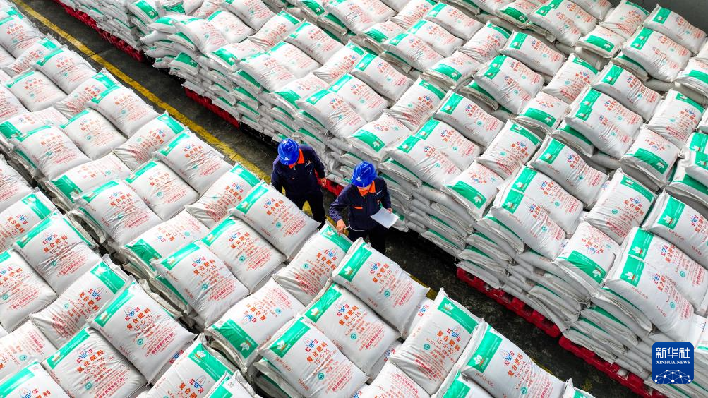 2月18日,在云南省开远市一家化肥企业,仓管员在检查化肥储备情况(无人机照片)。新华社发(陶家淇摄)
