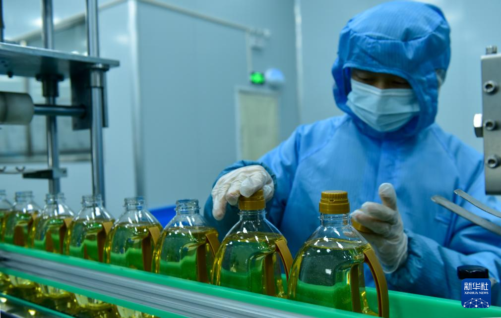 2月18日,在重庆市酉阳土家族苗族自治县一家油茶公司茶油生产车间,工人在生产线上忙碌。新华社发(邱洪斌摄)