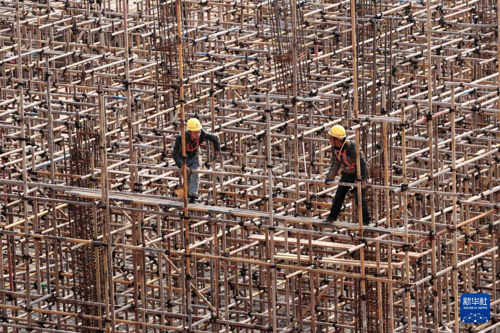 2月18日,中铁八局的工人在渝湘高铁重庆黔江段黔江站综合交通枢纽工程工地施工。新华社发(杨敏摄)