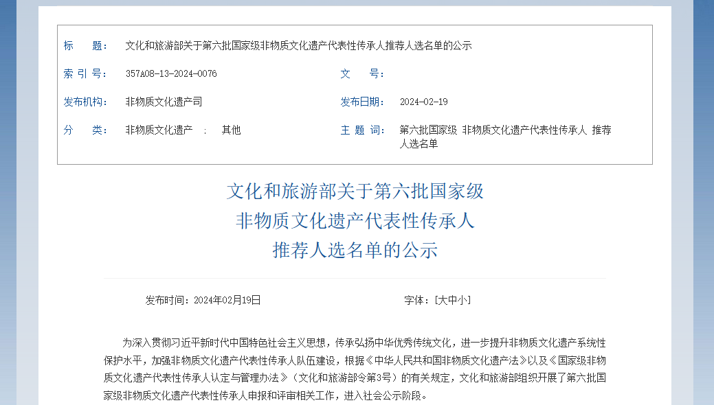 为深入贯彻习近平新时代中国特色社会主义思想,传承弘扬中华优秀传统文化,进一步提升非物质文化遗产系统性保护水平,加强非物质文化遗产代表性传承人队伍建设,根据《中华人民共和国非物质文化遗产法》以及《国家级非物质文化遗产代表性传承人认定与管理办法》(文化和旅游部令第3号)的有关规定,文化和旅游部组织开展了第六批国家级非物质文化遗产代表性传承人申报和评审相关工作,进入社会公示阶段。