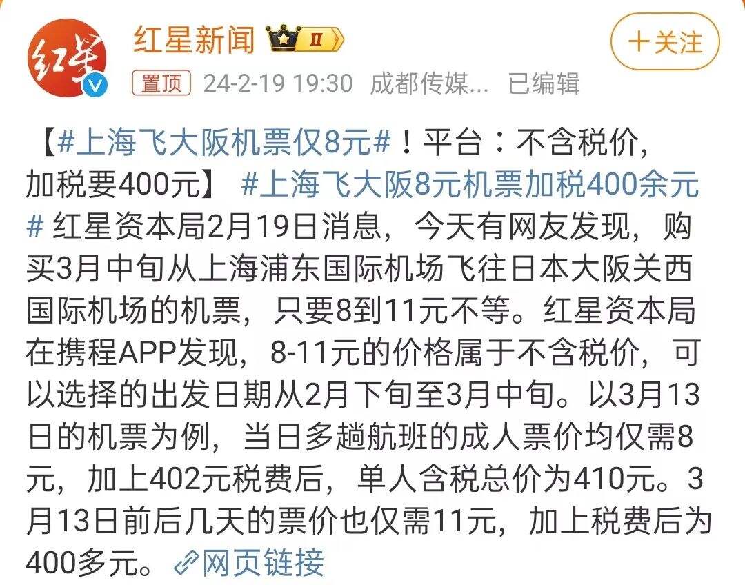 “大跳水”!上海飞往日本大阪只要8到11元!昆明到大阪……
