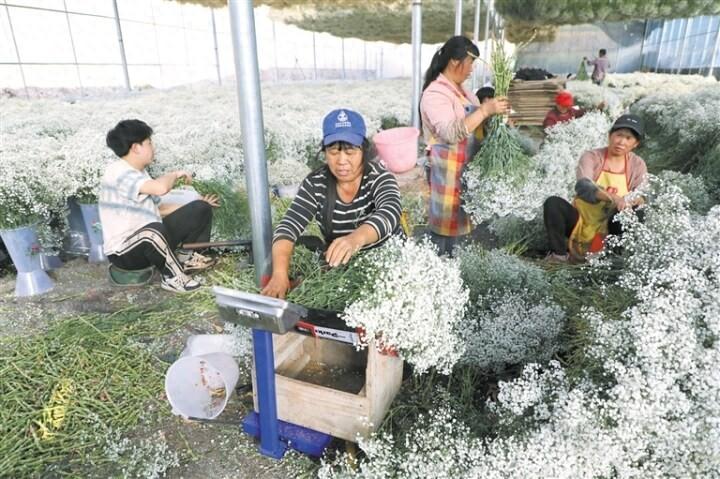 沙滩地上,一片片露天种植的满天星开得正好,淡淡的花香扑鼻而来。种植基地负责人金朝花正带领务工群众整理加工满天星,以便卖个好价钱。