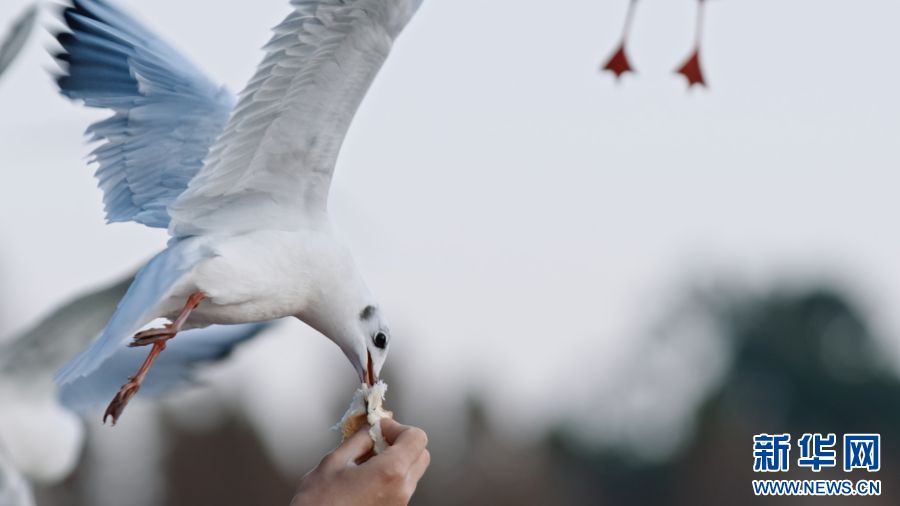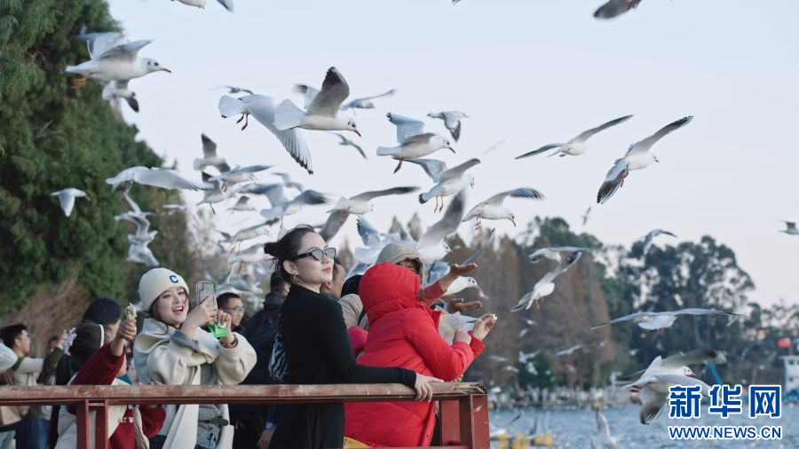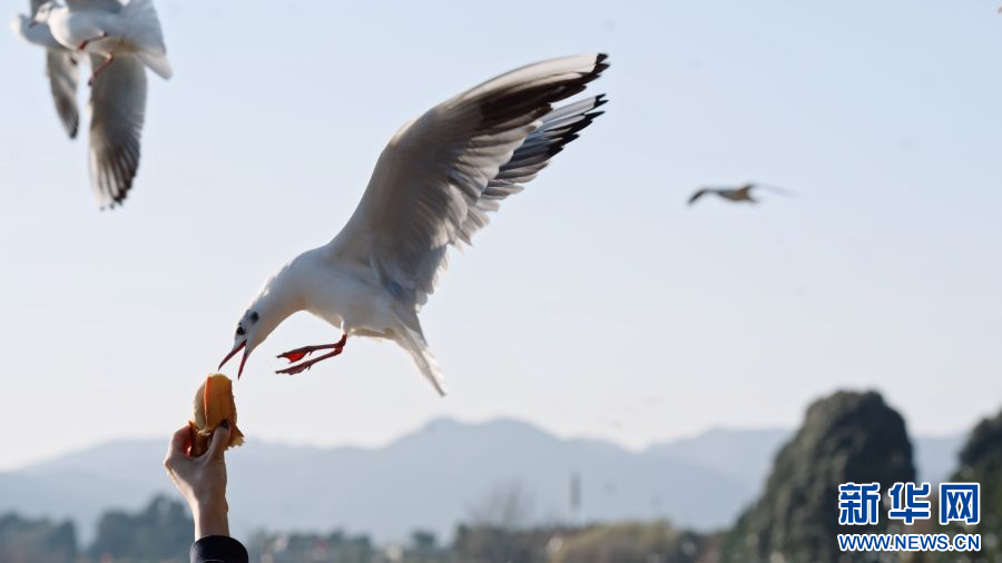 游人在昆明海洪湿地公园观赏、投喂红嘴鸥(2月18日摄)。新华网 刘东 摄
