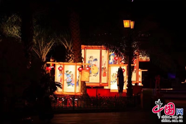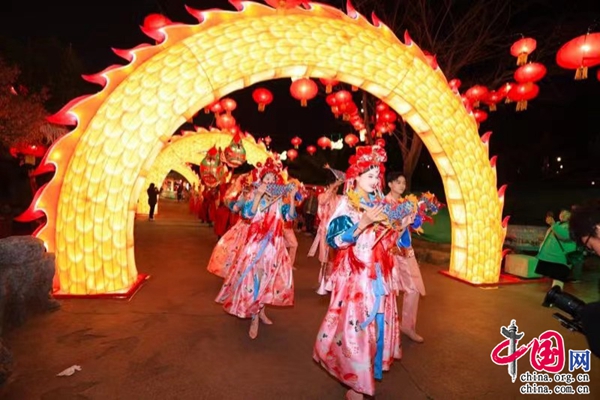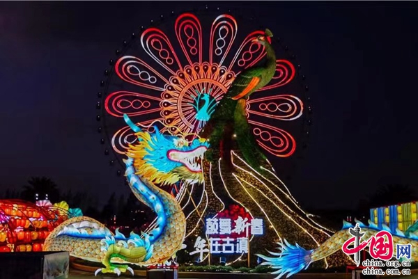 傍晚时分,天色渐暗,一盏盏形态各异的花灯悉数亮起。象征着幸福和繁荣的鲤鱼形象的鱼灯,有着“年年有余”“吉祥如意”等美好寓意。它们用彩绸、竹篾等材料制作而成,色彩鲜艳、栩栩如生。长达百米的巨龙盘踞在七彩云南欢乐世界中,龙身背后星星点点的红灯笼相应呈现生肖龙与中国红元素的巧妙融合。