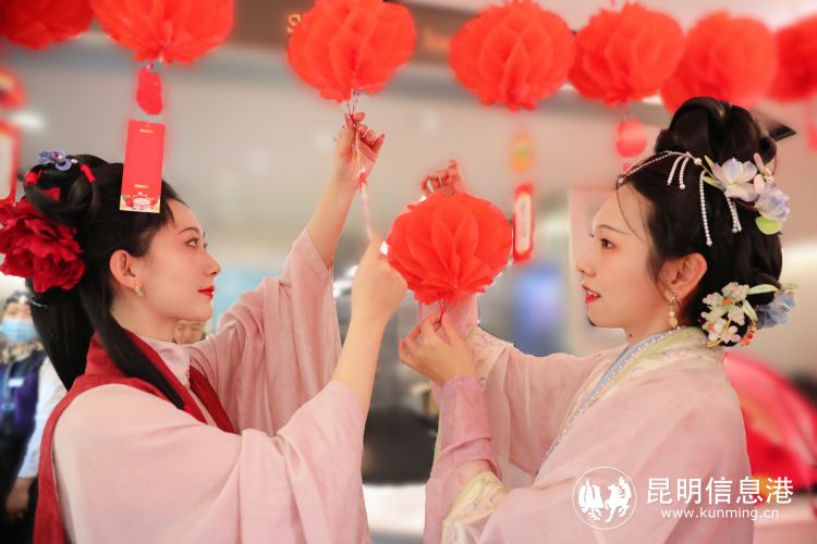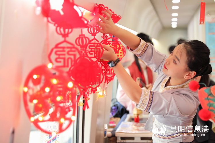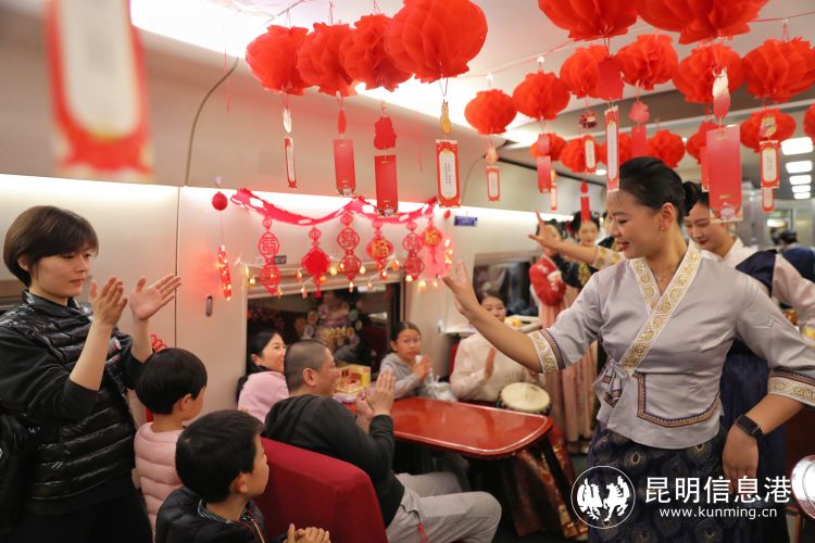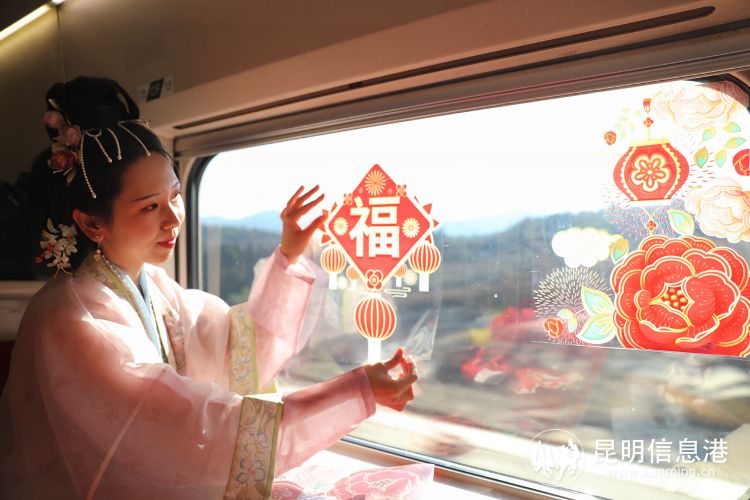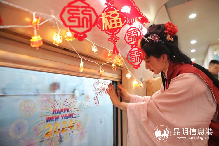 餐吧车里张灯结彩、喜气洋洋。红红的灯笼,透着团圆的喜庆;精美的窗花贴纸,带着美好的祝福。身着民族服装和“唐、宋、明”制汉服的“金花”乘务员,更是成为车厢里的聚焦点。