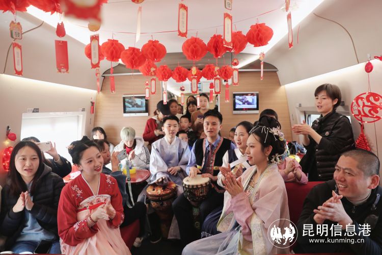 随后,“金花”列车长李文雯为旅客们演奏手碟。美妙的音乐让大家舒缓旅途疲劳,放松心情;两位“金花”乘务员伴随着欢快的音乐,为旅客们表演傣族舞蹈《耿马》,让旅客感受到民族地区的热情好客和欢乐氛围;手鼓表演《最炫民族风》,让车厢里的气氛顿时“热辣滚烫”起来,几名小旅客还随着伴奏跳起了“科目三”舞蹈,车厢里氛围感顿时拉满,热闹的场面让人目不暇接。