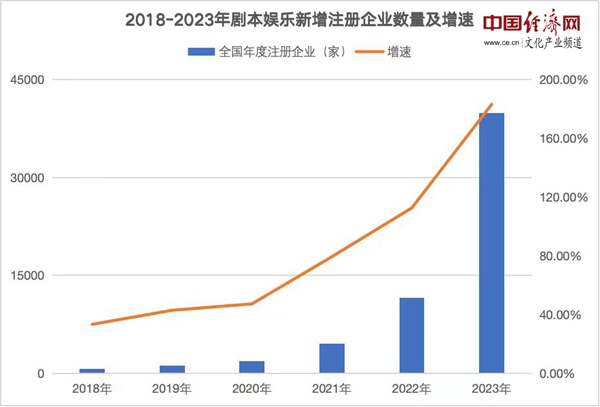 我国剧本娱乐行业起源于2012年前后,2016年兴起,并迎来飞速发展,2018至2022年,剧本娱乐经营场所总体数量增长幅度超过400%。天眼查数据显示,截至目前,现存剧本娱乐相关企业5.2万余家;其中,2023年1-12月,新增注册相关企业3.5万余家,与2022年同比增加222.7%。