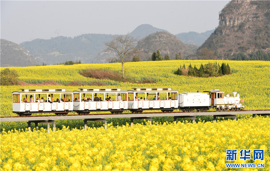 游人在云南省罗平县乘坐小火车穿越油菜花海(2月20日摄)。