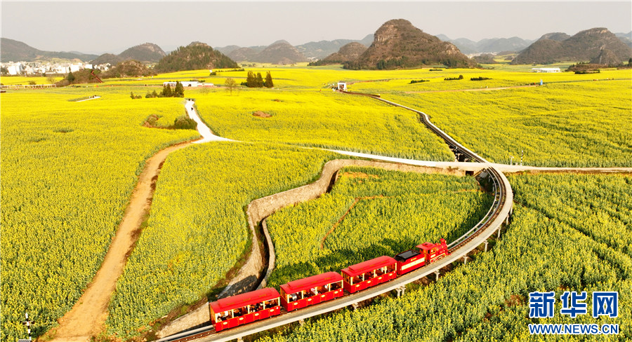 近日,云南省曲靖市罗平县近百万亩油菜花竞相绽放,微风吹过,油菜花海泛起黄色波浪,与峰林、村庄、树林相映成趣,勾勒出美丽春色,吸引了大量游客前来赏花游玩。近年来,罗平县将油菜产业与文旅产业深度融合,带动乡村餐饮、民宿等蓬勃发展,助力乡村振兴。新华网发(毛虹 摄)