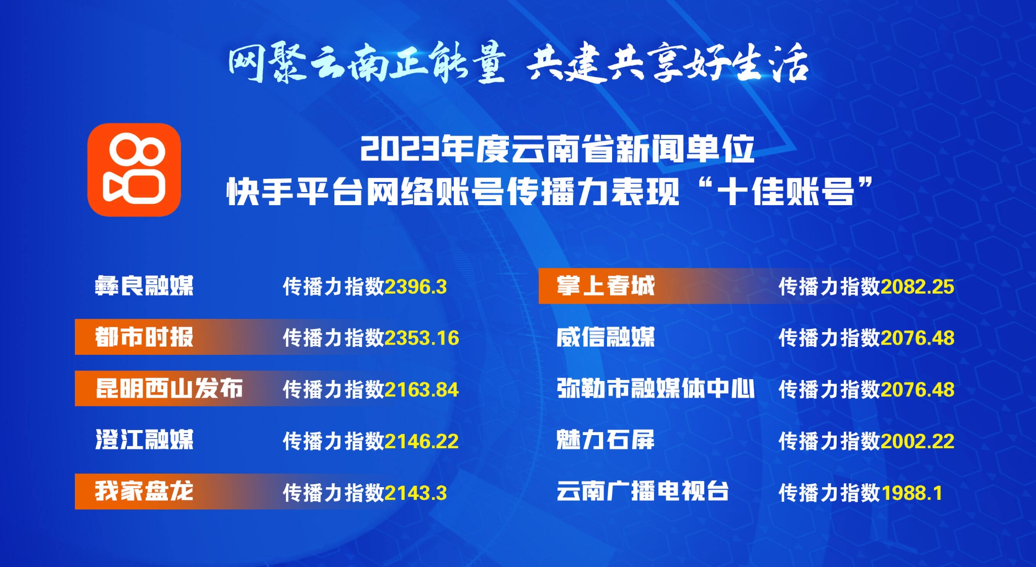 昆明市融媒体中心都市时报、掌上春城获评2023年度云南省新闻单位快手平台网络账号传播力表现“十佳账号”;