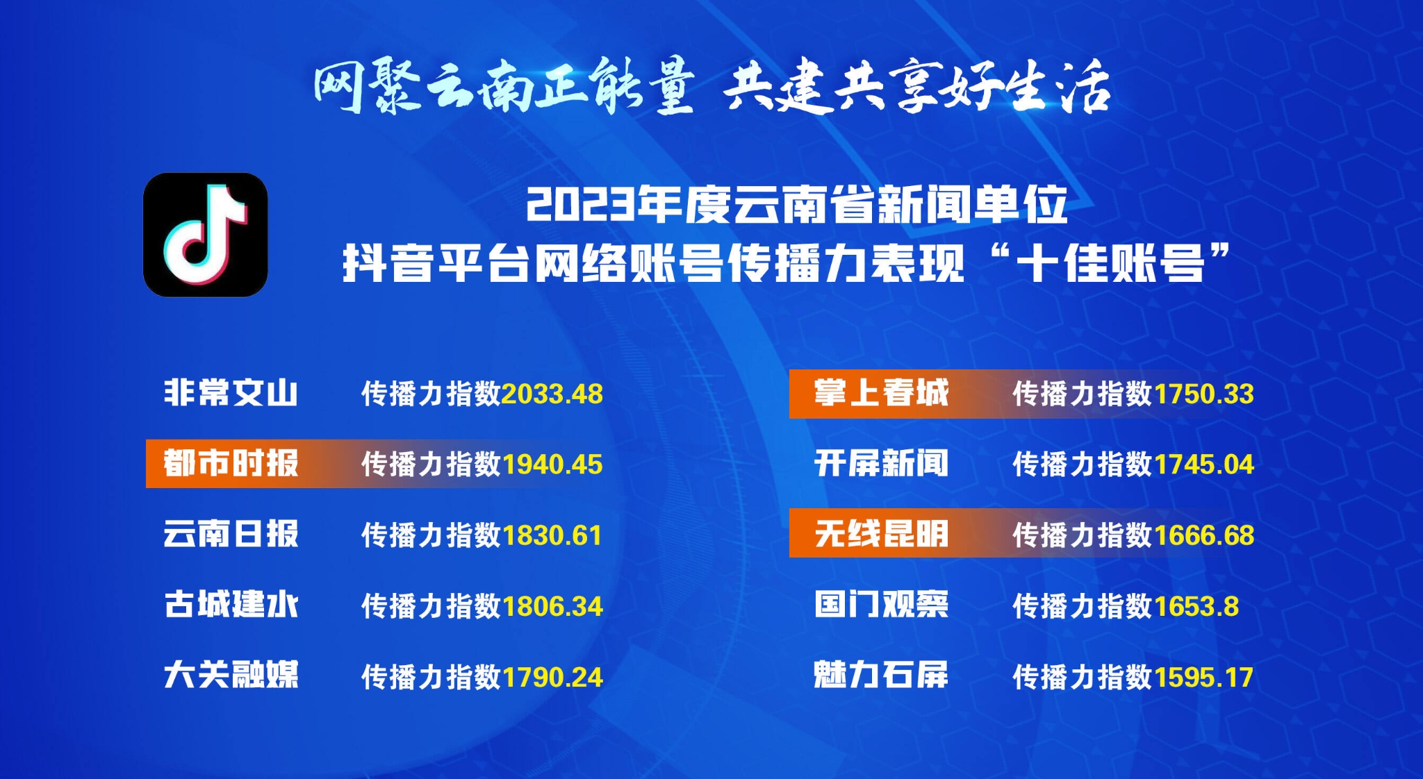 昆明市融媒体中心都市时报、掌上春城、无线昆明获评2023年度云南省新闻单位抖音平台网络账号传播力表现“十佳账号”。