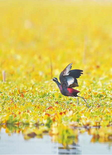 春节前夕,我国珍稀鸟种铜翅水雉飞临德宏州盈江县旧城镇香额湖景区。这一消息迅速传开,云南、广东、四川、浙江等地的生态摄影师聚焦香额湖,记录下了铜翅水雉的风采。铜翅水雉是我国二级重点保护野生动物,分布在亚洲南部的热带和亚热带地区。我国上次记录到是2013年12月23日,有人在盈江县那邦镇见到,后来再也没有人观察到它的身影。这次这只是全中国目前唯一能观察、记录到的1只铜翅水雉。(春城晚报 通讯员杨学飞 摄影报道)