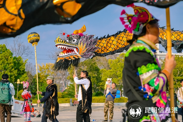 2月23日下午,“非遗过大年”永仁2024春节主题文化和旅游活动之一“永仁县非物质文化遗产代表性项目展演”在永仁县城举行。独具地方特色的传统舞龙、百人葫芦笙、赛装打跳、众人拔藤以及彝族服饰等非遗代表性项目让广大群众和八方游客感受到了非遗文化的魅力和浓厚淳朴的乡土风情。200余名民间歌舞表演者们从永仁县赛装文化广场出发,围绕县城重要干道一路进行舞龙和民俗展演,场面蔚为壮观。巡演过程中,由群众组织的队伍回到了群众中去,沿途的居民和游客们不仅可以欣赏到精彩的表演,还可以与表演者们互动,沉浸感受非遗文化的魅力。