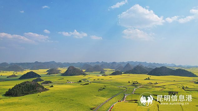 昆明信息港讯 记者上官艳君 正月未尽春已至,云南省曲靖市罗平县的百万亩油菜花正值最佳赏花季。春节假期刚结束,乘坐火车前往罗平赏花的游客如约而至,百万亩油菜花在云南罗平坝子竞相绽放,放眼望去,一片一望无际的金色田野与翠绿群山交相辉映,一副生机勃勃的春日画卷引人入胜。