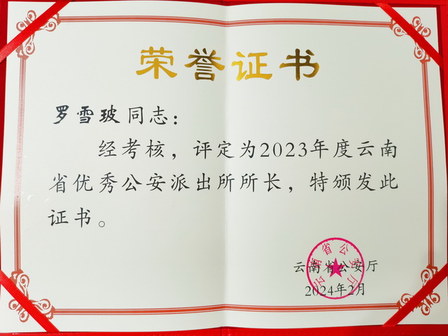 2月27日,全省州市公安局长会议在昆明召开。会议对优秀县公安局局长、政委、派出所所长进行了表彰。凤庆县公安局洛党派出所所长罗雪玻榜上有名,被表彰为“优秀派出所所长”。