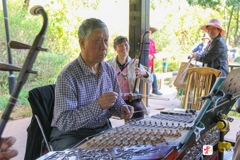 弥勒寺公园的游人覆盖到了全年龄段,凉亭里人们演奏民乐