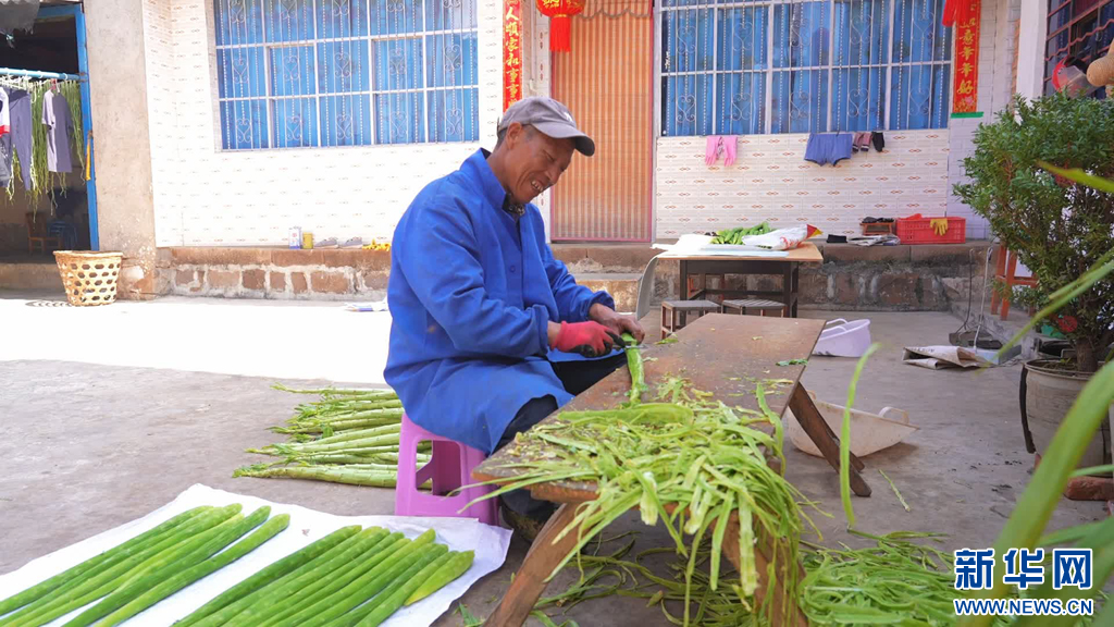田园里,有的群众忙着采收蒜苔,有的则挥舞着农具收割贡菜。在古底村委会永和村,家家户户忙着加工贡菜,削皮、开条、晾晒,院落里一排排鲜绿的长条徜徉在春光里。