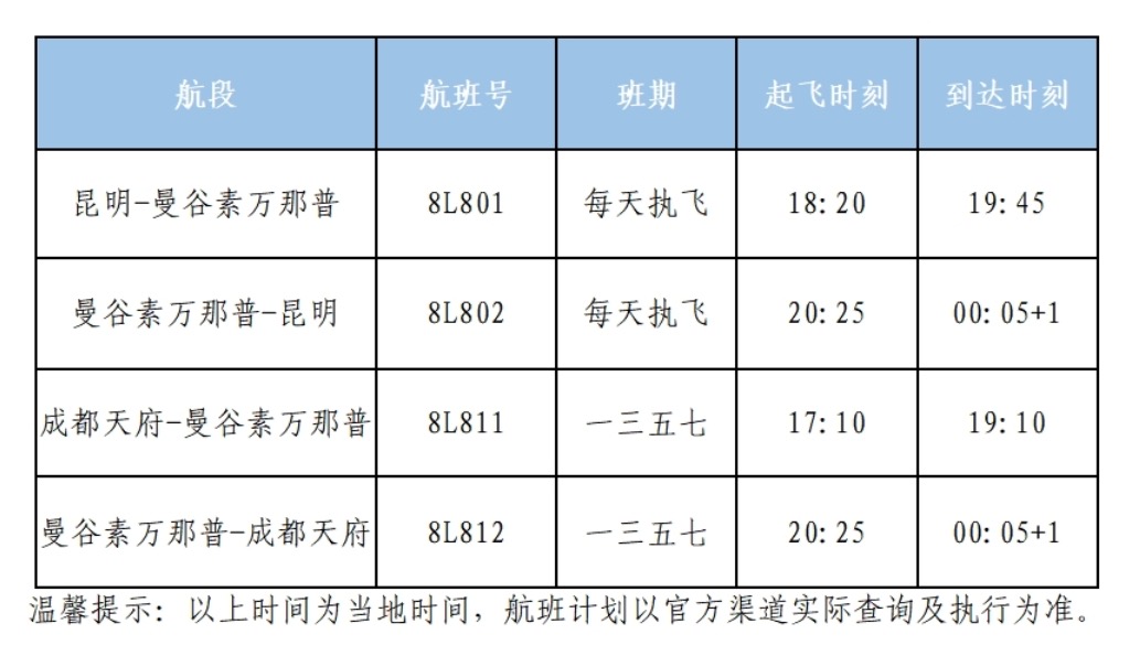 据悉,祥鹏航空昆明⇋曼谷(素万那普)航班每天执飞;去程航班8L801,于18:20从昆明长水机场起飞,19:45到达曼谷素万那普机场。回程航班8L802,于20:25从谷素万那普机场起飞,次日00:05到达昆明长水机场;成都(天府)⇋曼谷(素万那普)航班,复航日期为2024年4月5日,班期为每周一、三、五、日往返;去程航班8L811,于17:10从成都天府机场起飞,19:10到达曼谷素万那普机场。回程航班8L812,于20:25从曼谷素万那普机场起飞,次日00:05到达成都天府机场;以上均为当地时刻。