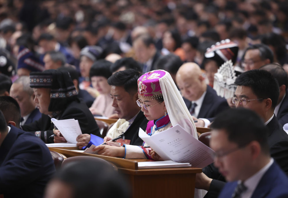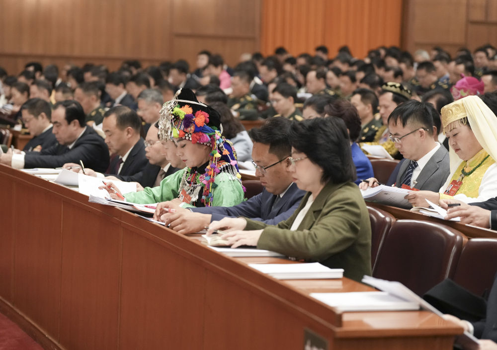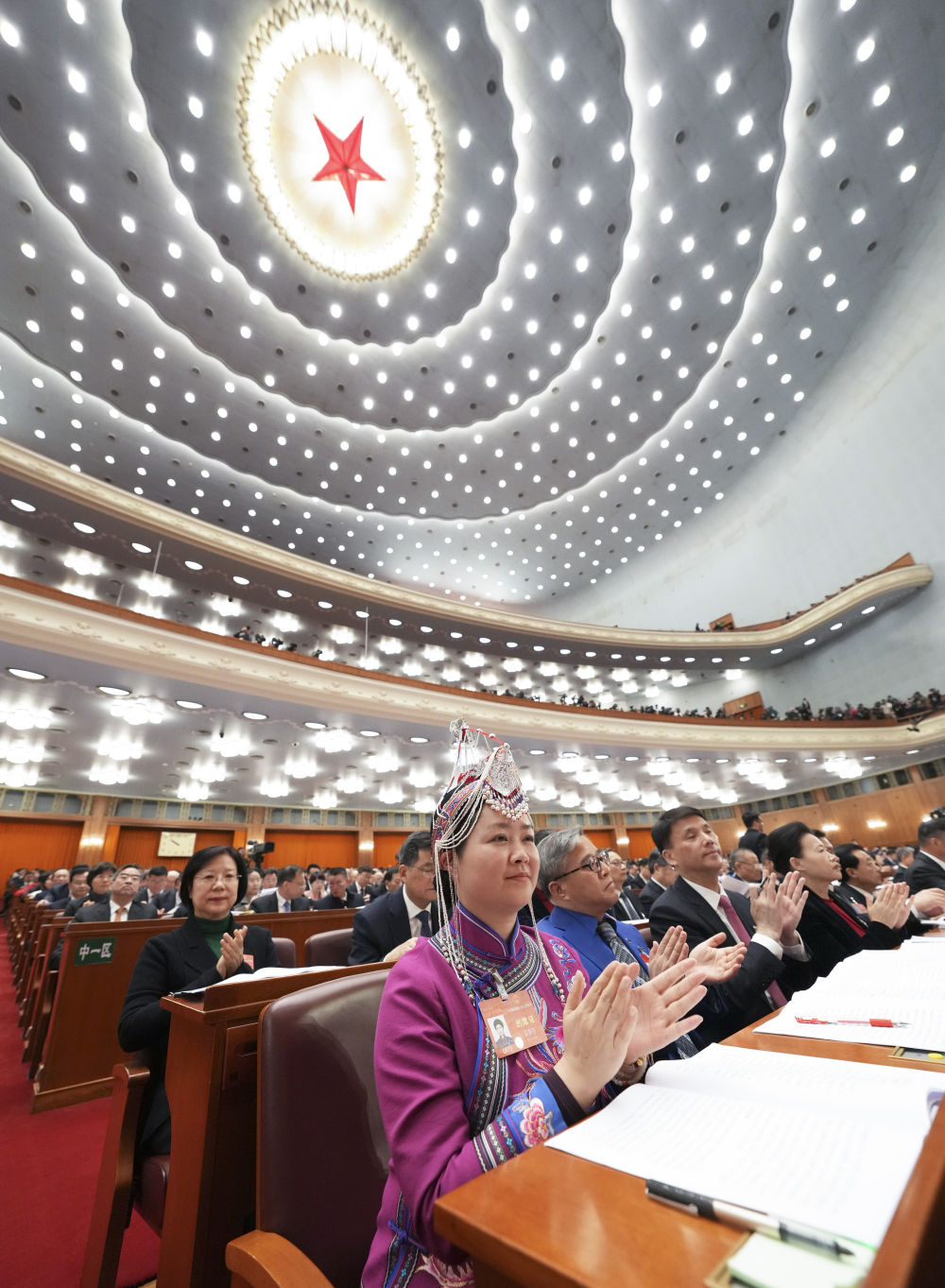 3月5日,第十四届全国人民代表大会第二次会议在北京人民大会堂开幕。这是代表们在认真听会。