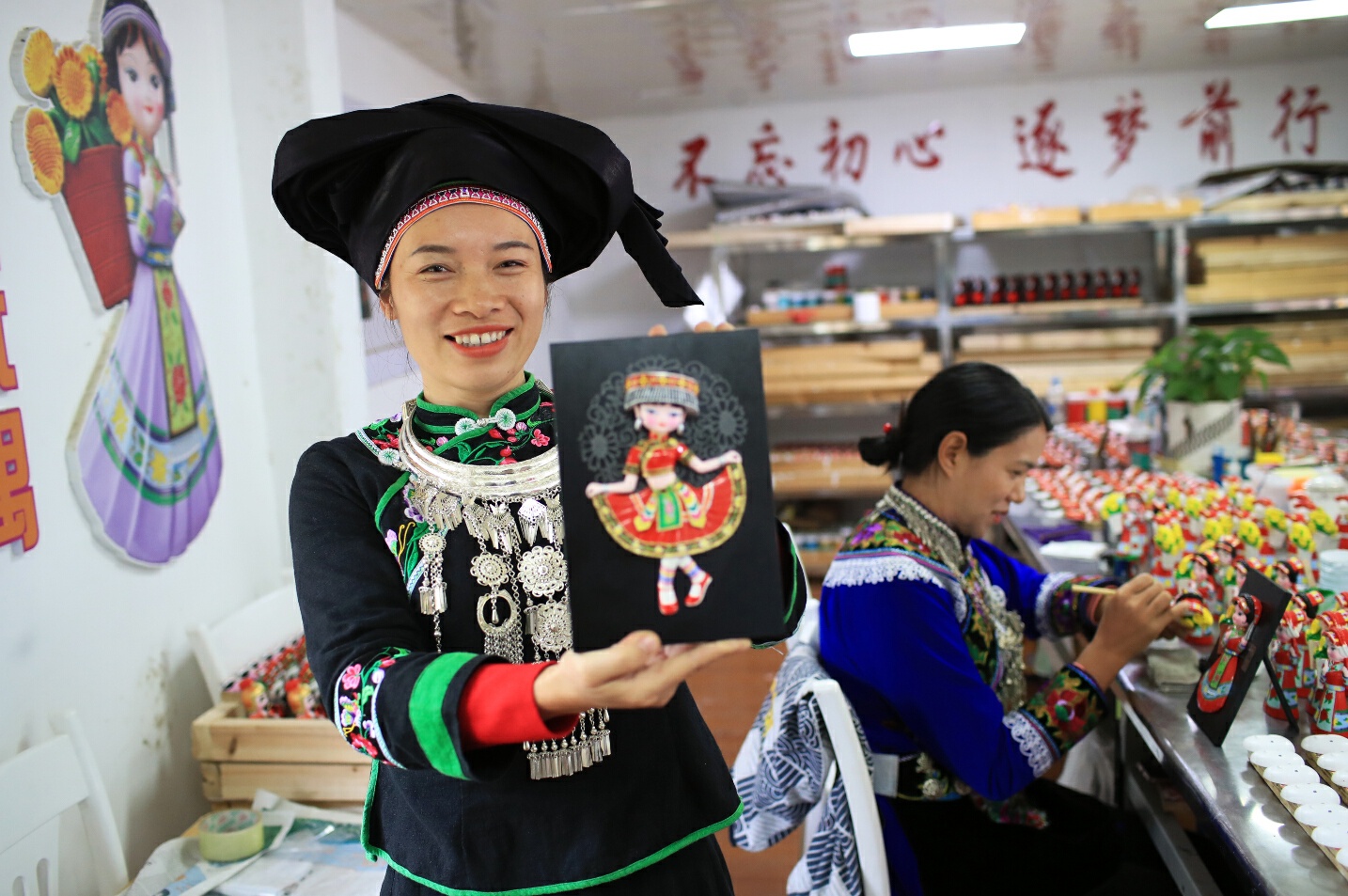 文山西畴县西洒镇瓦厂村委会汤谷村汤谷文创车间,壮族姑娘制作的彩绘玩偶。