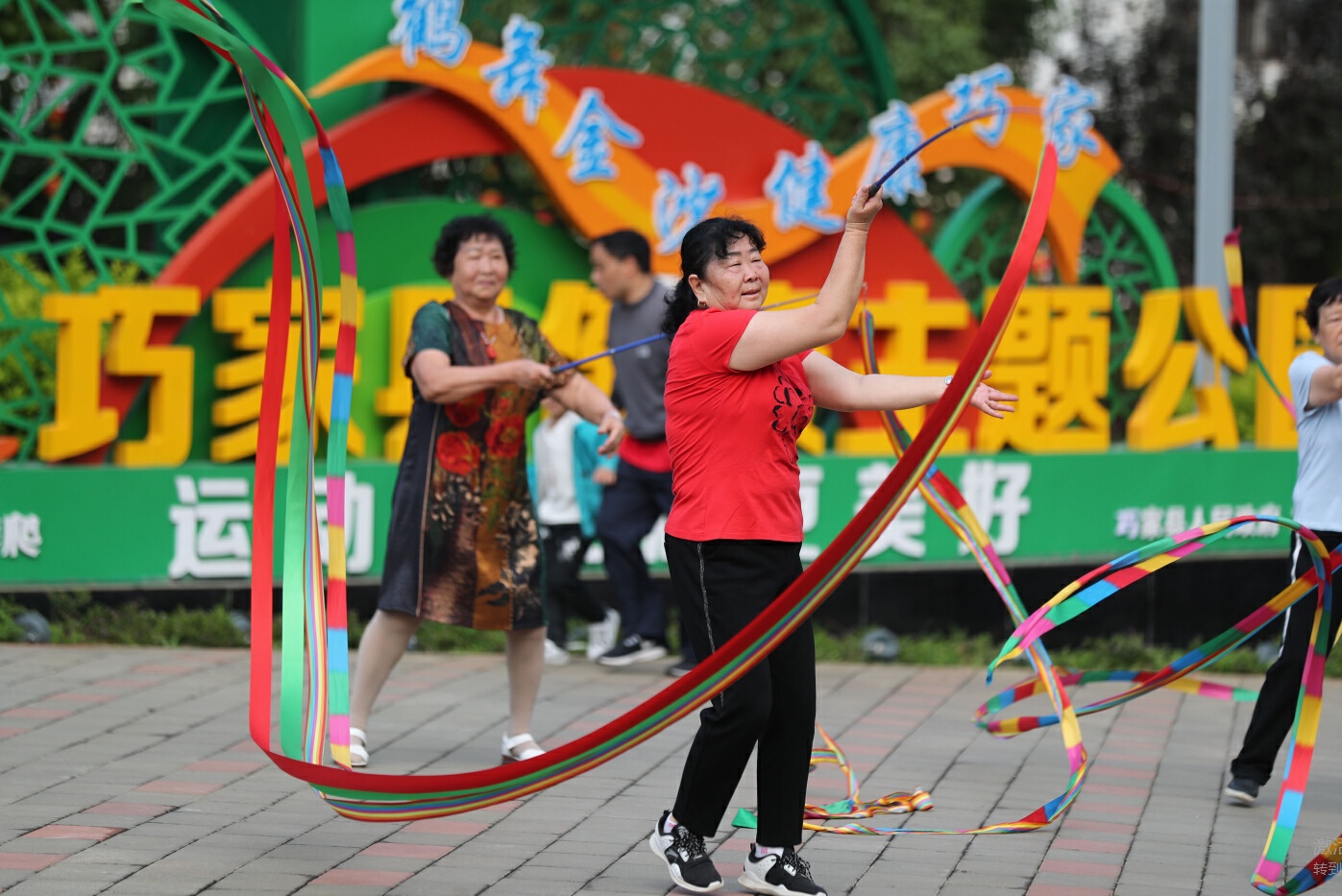 昭通市巧家县健康主题公园里,老人们表演彩绸舞。