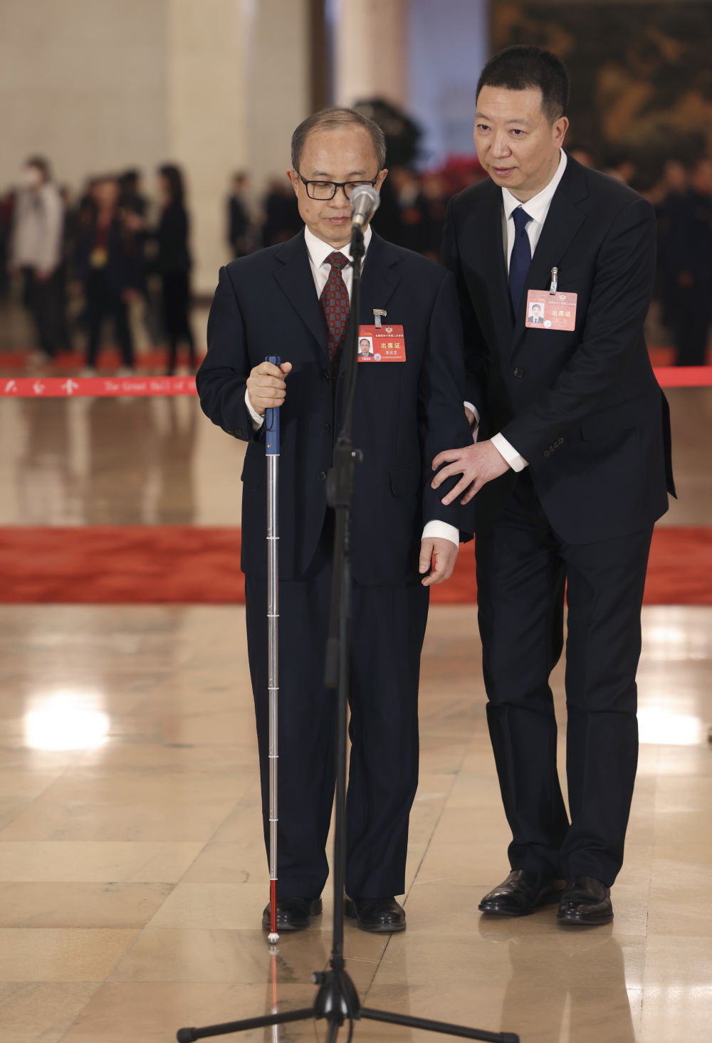 3月4日举行的首场“委员通道”集体采访活动上,全国政协委员李庆忠(左)在全国政协委员郑鈜的帮助下准备接受媒体采访。