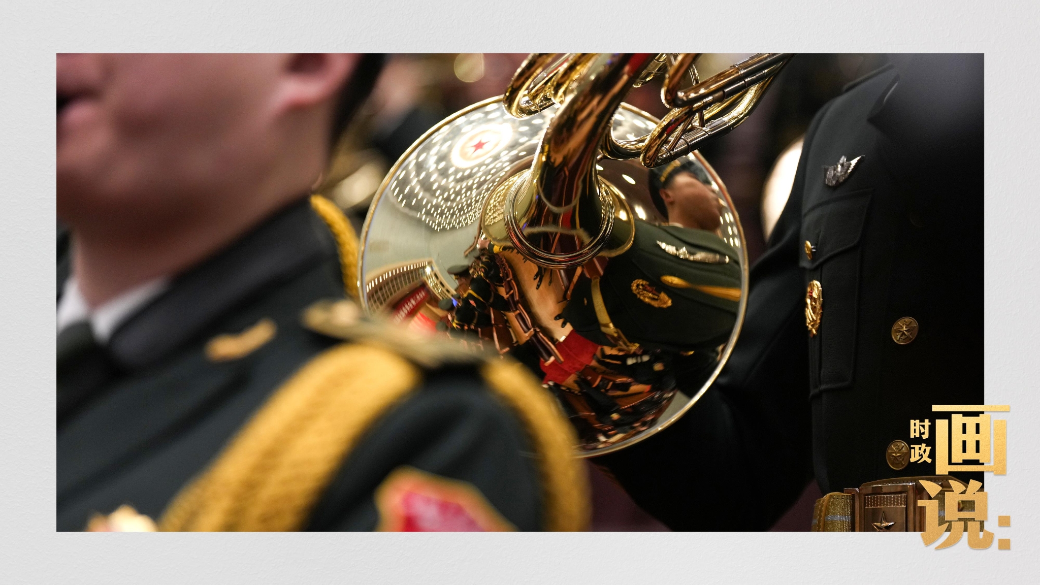△中国人民解放军军乐团奏响国歌,金色的圆号倒映出大礼堂全貌。