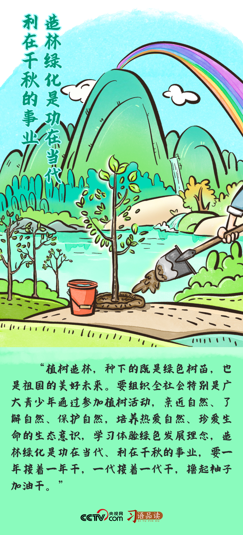 2017年3月29日,在参加首都义务植树活动时,总书记强调:“植树造林,种下的既是绿色树苗,也是祖国的美好未来。要组织全社会特别是广大青少年通过参加植树活动,亲近自然、了解自然、保护自然,培养热爱自然、珍爱生命的生态意识,学习体验绿色发展理念,造林绿化是功在当代、利在千秋的事业,要一年接着一年干,一代接着一代干,撸起袖子加油干。”