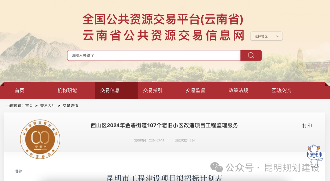 3月14日,云南省公共资源交易信息网发布了“西山区2024年金碧街道107个老旧小区改造项目工程监理服务”公告,围绕着昆明市西山区金碧街道107个老旧小区提升改造工作的工程监理服务进行招标。