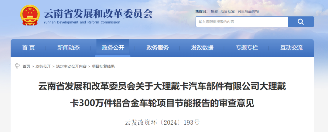《大理白族自治州发展和改革委员会关于请求对大理戴卡汽车部件有限公司大理戴卡300万件铝合金车轮项目节能报告进行审查的请示》(大发改资环〔2023〕454号)收悉。根据《中华人民共和国节约能源法》、《固定资产投资项目节能审查办法》(国家发展改革委令2023年第2号)、《云南省发展和改革委员会关于加强固定资产投资项目节能审查工作的通知》(云发改资环〔2017〕299号)有关要求,省发展改革委委托云南省节能监察中心组织有关专家对该项目(项目代码:2310-532932-04-05-531486)节能报告进行了评审,对项目能源消费情况、能效水平、用能工艺及节能管理措施等提出如下意见:
