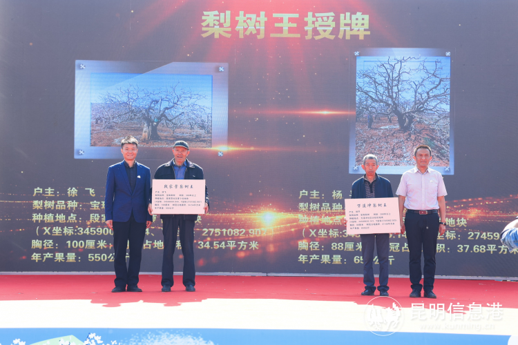 活动为万溪冲梨树王代表杨平、段家营梨树王代表徐飞颁授“梨树王”牌匾。