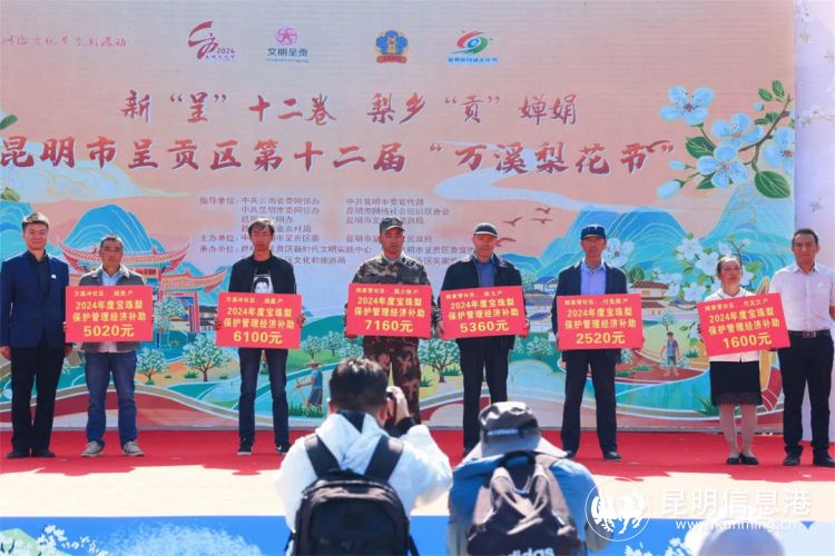 活动现场发布了《昆明市呈贡区宝珠梨树保护管理办法》落实情况,并为万溪冲、郎家营、段家营的梨树管养责任人代表兑付保护管理经济补助。