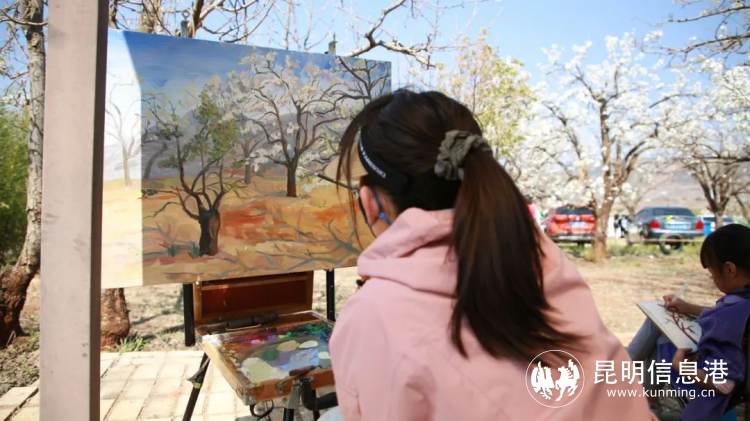梨花树下“女画家画家乡”活动已经连续多年举办。15位女画家分布在梨园各处,聚精会神地开始创作。