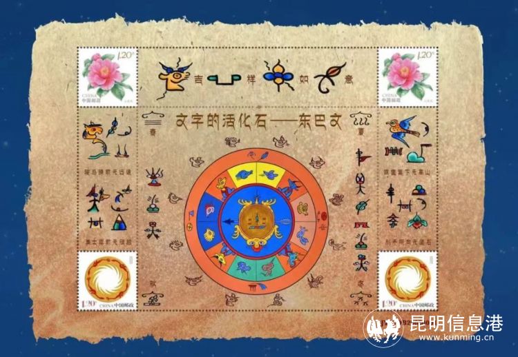 《文字的活化石——东巴文》个性化邮票首次在个性化邮票上应用雕刻技术,让东巴文更显立体,色彩鲜明,与东巴文化相得益彰。邮票以纳西族特有的纸张——东巴纸纹理为设计底图,中心表现纳西传统纹样“巴格图”和东巴十二生肖,周围饰以东巴文“吉祥如意”和“骏马蹄前无远途、勇士阵前无顽敌、雄鹰翼下无高山、利矛所向无坚石”四句纳西谚语。
