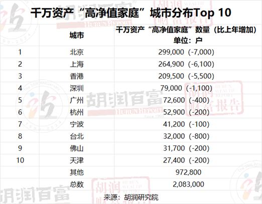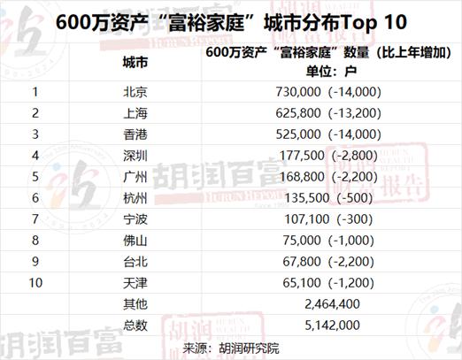 600万资产“富裕家庭”城市分布Top 10