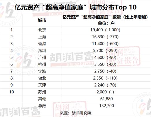 亿元资产“超高净值家庭”城市分布Top 10