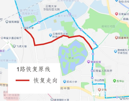 1路起终站为“西北部公交枢纽站(起终站)——东站(环城南路)(终到站)”。1路将恢复停靠“建设路(去)、府甬道(去)、云南大学(翠湖北路)(去)”等3个公交站,取消停靠青云街施工期间临时停靠的“师范大学(西南联大博物馆)(去)、园西路口(北门街)(去)、丁字坡(去)、圆通街口(北门街)(去)”等4个公交站。同时,新增停靠“华山西路站D口”公交站,无缝接驳地铁5号线华山西路地铁站。