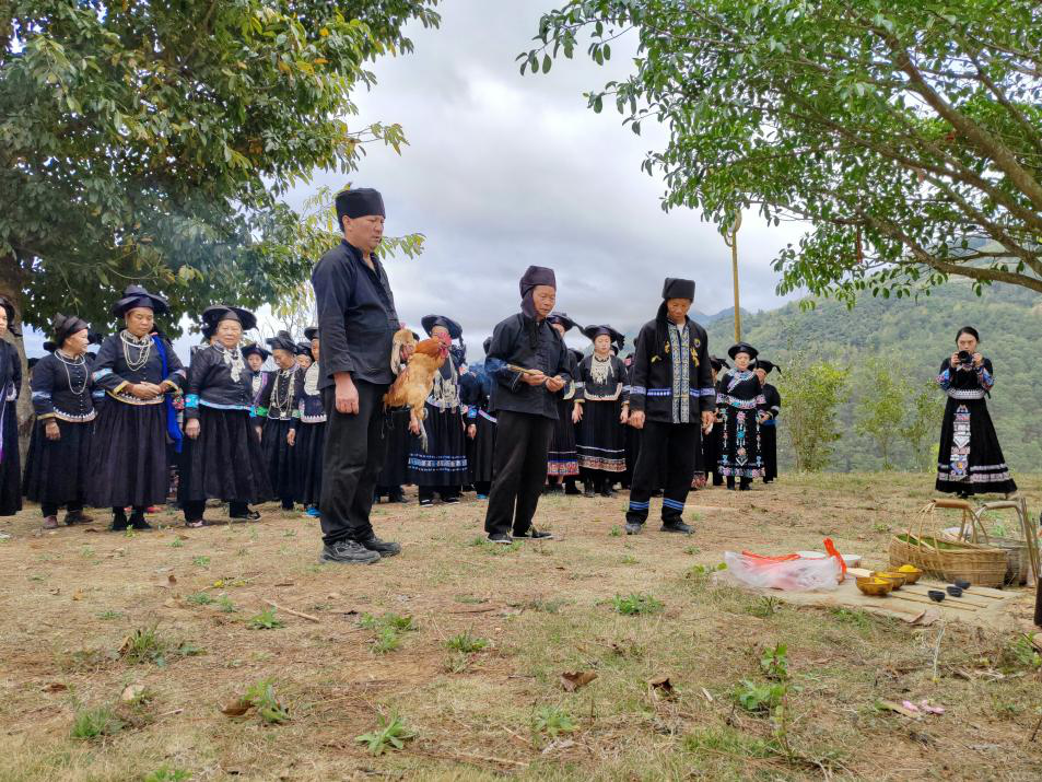 随后,祭司手抱红公鸡带领大家走过十二道弯,每一道弯都有一个传说,蕴含着壮家人古老而神奇的色彩。爬上太阳山后,女子们在祭台上围成圆圈吟唱《太阳古歌》,将太阳送回天上,德高望重的太阳祭祀传承人献上鸡、黄糯米饭等祭品。整个仪式,除了带领祭祀的传承人外,所有的男人都不可进入祭坛,全部由女人完成。