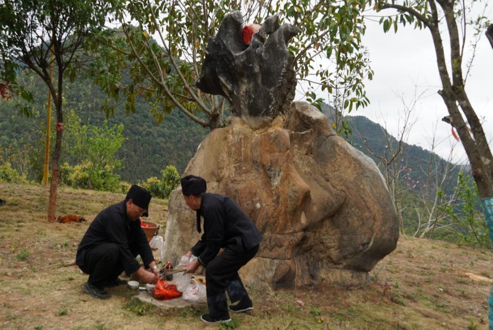 在太阳神树下,女人们由祭司带领,在神树下的祭台前用红公鸡祭请太阳,用特别染制的金黄色糯米饭“献太阳”。大家一起祭拜、唱诵《祭太阳古歌》迎请太阳上山,祈求风调雨顺,人丁兴旺。