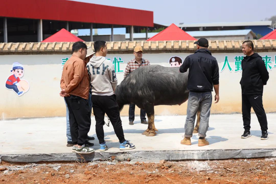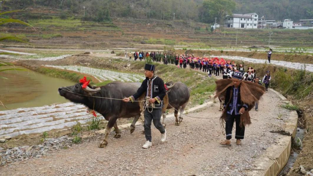 在西畴县蚌谷乡达孟海子村,村里的壮族群众身穿精美的民族服饰聚在一起有说有笑,现场热闹非凡。参加活动的群众排成两列整齐的队伍,随后,三名群众牵着三头头戴红绸大花的水牛来到队伍最前排,大家唱着壮族歌曲、跳着舞蹈,边走边唱把牛牵到田地里,解下牵牛绳,让牛肆意吃草。