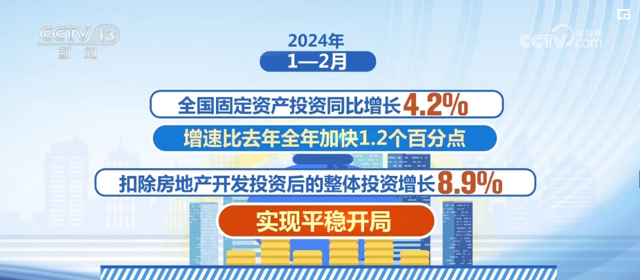 国家发展和改革委员会副主任刘苏社介绍,2024年以来,国家发展改革委会同有关方面,充分发挥政府投资的带动放大效应。1—2月,全国固定资产投资同比增长4.2%,增速比2023年全年加快1.2个百分点;扣除房地产开发投资后的整体投资增长8.9%,实现平稳开局。