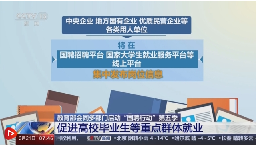 央视网消息:近日,教育部会同人力资源社会保障部、国务院国资委、共青团中央、全国妇联、全国工商联和中央广播电视总台印发通知,联合开展2024年度高校毕业生等重点群体促就业“国聘行动”。