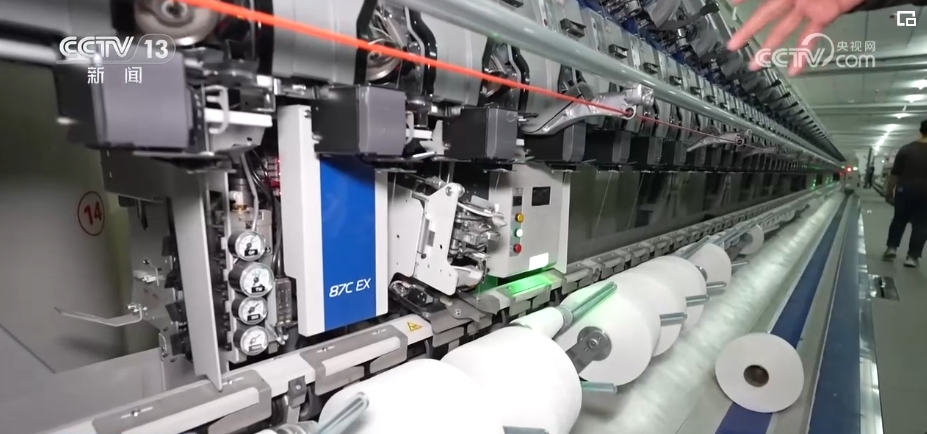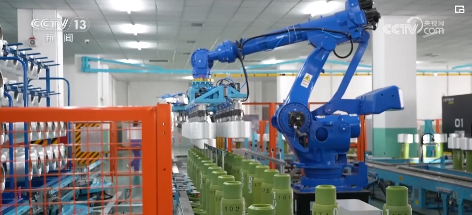 纱线断头曾经是纺织厂里最头疼的事。人工打结不仅效率低,还会影响布面质量,而现在,拥有智能识别系统的新设备可以精准鉴别断了的纱线,再通过机械臂自动接合。纺好的纱线通过天花板轨道,“一站式”进入库房,带有芯片装置的运输机能够根据颜色智能分类。整个车间的134台智能设备全部接入大数据平台以后,设备的产量、运行的效率,所有数据都能清晰呈现在办公室的大屏里。