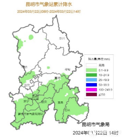 据昆明市气象局相关工作人员介绍,3月22日8时至12时,全市普降小到中雨,共出现小雨261站、中雨3站,最大雨量出现在安宁市凤仪水库11.1毫米。2024年进入2月中旬后,昆明持续晴热无雨,气温回升快,风速加大,森林火险气象等级快速升高到4至5级(高至极高等级),较常年提前一个月达到高等级。气象干旱呈快速发展趋势,截止到3月21日,昆明市东川、禄劝北部、安宁、晋宁、石林部分地区出现重度气象干旱,其余县市区为中度气象干旱。