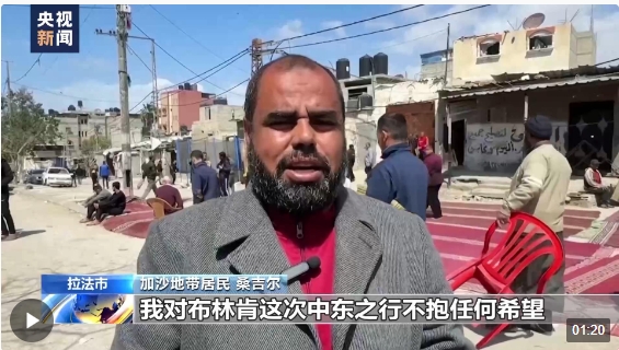 加沙地带居民 桑吉尔:作为一名巴勒斯坦人,我对布林肯这次中东之行不抱任何希望,他还访问了以色列。在他之前的几次访问中,没有为巴勒斯坦人民取得成效,也未能促进加沙地带停火。在停火这一问题上,美国政府没有任何作为。