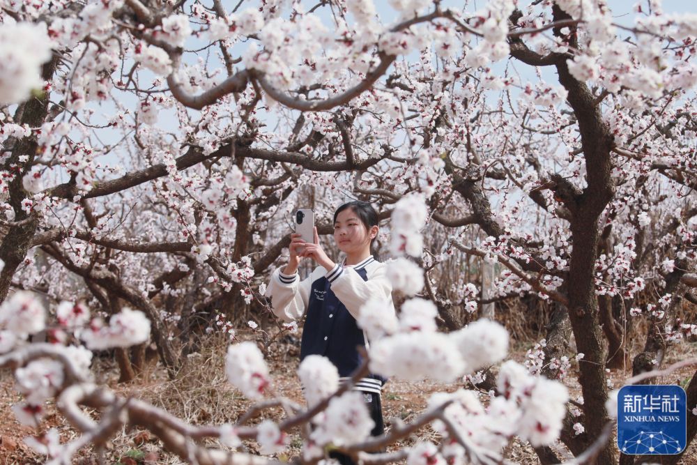 3月23日,游人在山东省临沂市平邑县一处杏花园里拍照游玩。新华社发(武纪全摄)