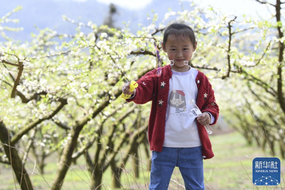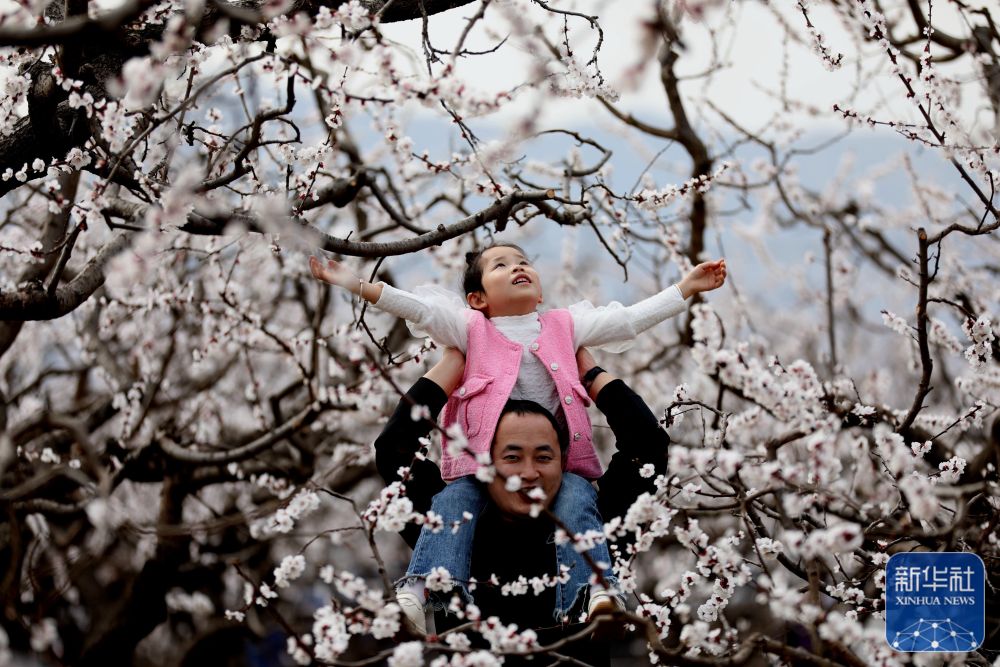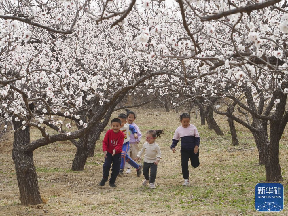 3月23日,小朋友在河北省石家庄市鹿泉区山南张庄村的杏林中玩耍。新华社发(闫志国摄)