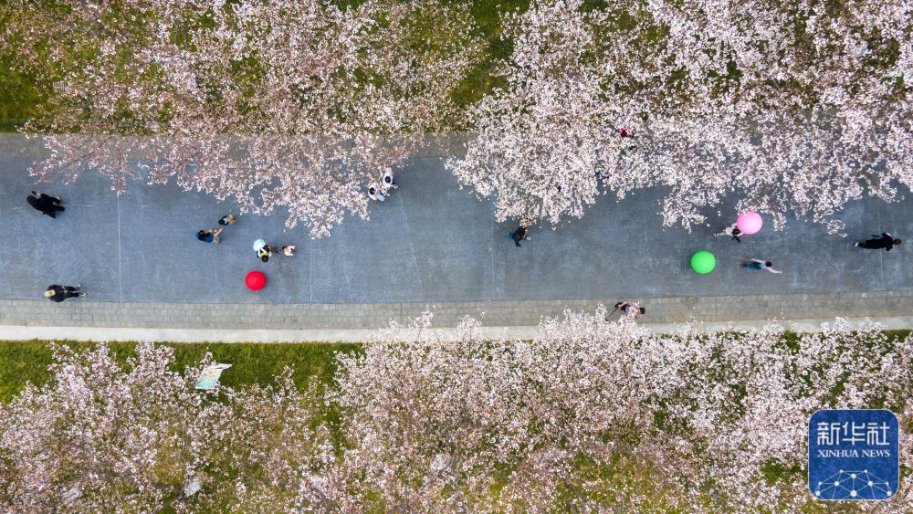 3月23日,游人在浙江省金华市国际友城公园樱花大道上赏景游玩(无人机照片)。新华社发(胡肖飞摄)