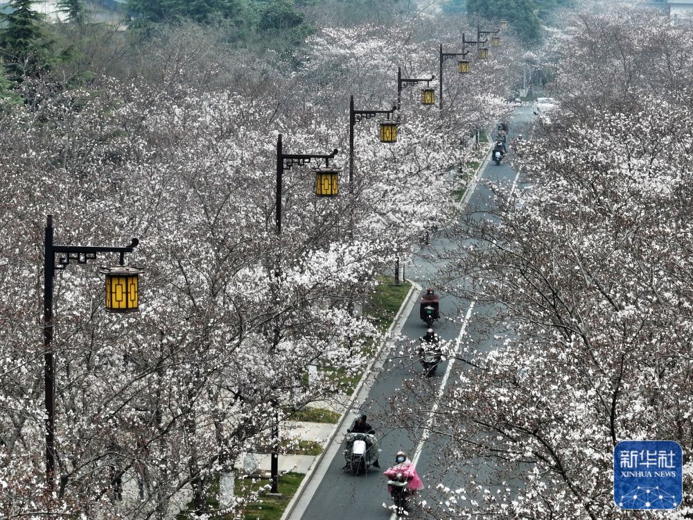 3月23日拍摄的江苏省扬州市鉴真路的“樱花大道”景色(无人机照片)。新华社发(孟德龙摄)