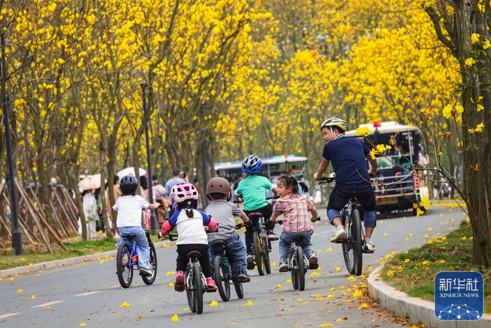 3月23日,在广西南宁市青秀山景区风铃谷,游人骑自行车在黄花风铃木花海长廊畅游。新华社发(喻湘泉摄)